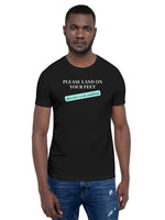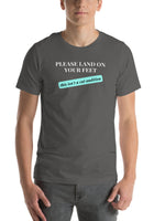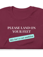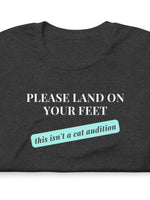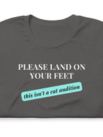 Embrace the fun side of gymnastics with this bold and witty tee! Featuring the cheeky phrase "Please land on your feet. This isn't a cat audition" printed large and centered on the front, this shirt is perfect for those who know the value of a solid landing. Designed for adults who appreciate a mix of humor and athleticism, this tee combines comfort with a light-hearted message. Whether you're training, coaching, or just showing your gymnastics pride, this shirt adds a playful touch to your wardrobe.