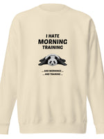 For those who feel the struggle of early mornings and training sessions, this sweatshirt says it all. Featuring an adorable panda sprawled out on the floor alongside the text "I hate morning training… and morning… and training," this design speaks to every tired athlete. The big front and center print brings a mix of humor and comfort, while the cozy material ensures you stay warm before or after workouts. Whether lounging or warming up for practice, this sweatshirt is perfect for anyone who’s not a fan of early alarms or tough gym sessions.