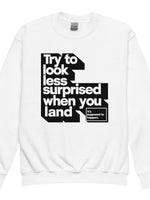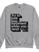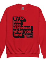 Get ready to land in style and humor! This cozy sweatshirt is perfect for young gymnasts who know that sticking the landing is no surprise—just skill! With the playful text "Try to look less surprised when you land. It's supposed to happen." boldly printed on the front, this essential piece blends comfort with personality. Ideal for both training days and casual wear, it’s crafted to keep up with all the tumbles and turns.
