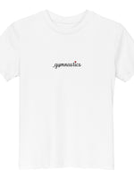 Embrace your passion with our Gymnastics Love Youth Tee. Featuring the word "gymnastics" with a heart dotting the "i", this centered embroidered design on the chest symbolizes dedication and love for the sport. Crafted from sustainable materials, this tee is perfect for young gymnastics enthusiasts who value both comfort and style. Join the movement and wear your passion proudly.