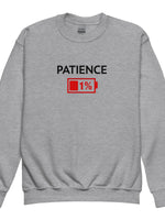 This cozy sweatshirt is perfect for kids who know the struggle of keeping their patience in check! Featuring the bold word "Patience" and a fun low-battery image showing just 1% remaining, it’s the perfect blend of humor and comfort. Whether they’re feeling full of energy or running low, this playful design is sure to be a hit with kids and youth who love to make a statement. Printed large and centered on the chest, it’s great for casual wear, keeping things cool and relatable all day long.