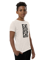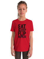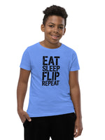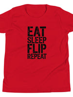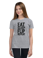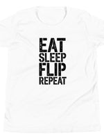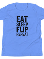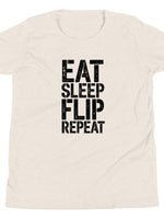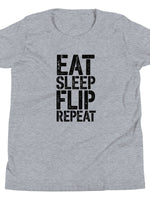 This t-shirt is perfect for active kids who live and breathe gymnastics. Featuring the bold “Eat Sleep Flip Repeat” design printed large and centered on the chest, it’s a must-have for every young gymnast in training. Made from soft, comfortable fabric, this shirt keeps up with all their energetic flips, tumbles, and routines. Whether at practice or hanging out with friends, it’s the ultimate statement piece for those who can’t stop flipping!