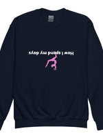 Elevate your young gymnast's style with this fun and inspiring sweatshirt featuring the bold phrase "How I Spend My Days" and a striking image of a female gymnast in a handstand. Designed for active kids who live and breathe gymnastics, this sweatshirt combines comfort and durability, making it perfect for both training sessions and everyday wear. Whether they're flipping through the air or just hanging out, this piece celebrates their passion in style.