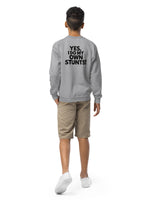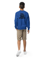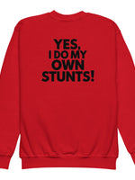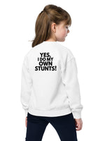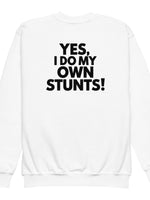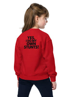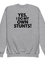 Get ready for action with this bold, playful sweatshirt from our essentials collection! Featuring a large, back-centered "Yes I do my own stunts!" print, this sweatshirt is perfect for energetic kids and youth who love to stand out. Made for comfort and designed to inspire, it’s ideal for chilly practice days or casual hangouts. The big, bold design ensures you make a statement, while the soft material keeps you cozy all day. Perfect for young stunt masters who like to take charge!